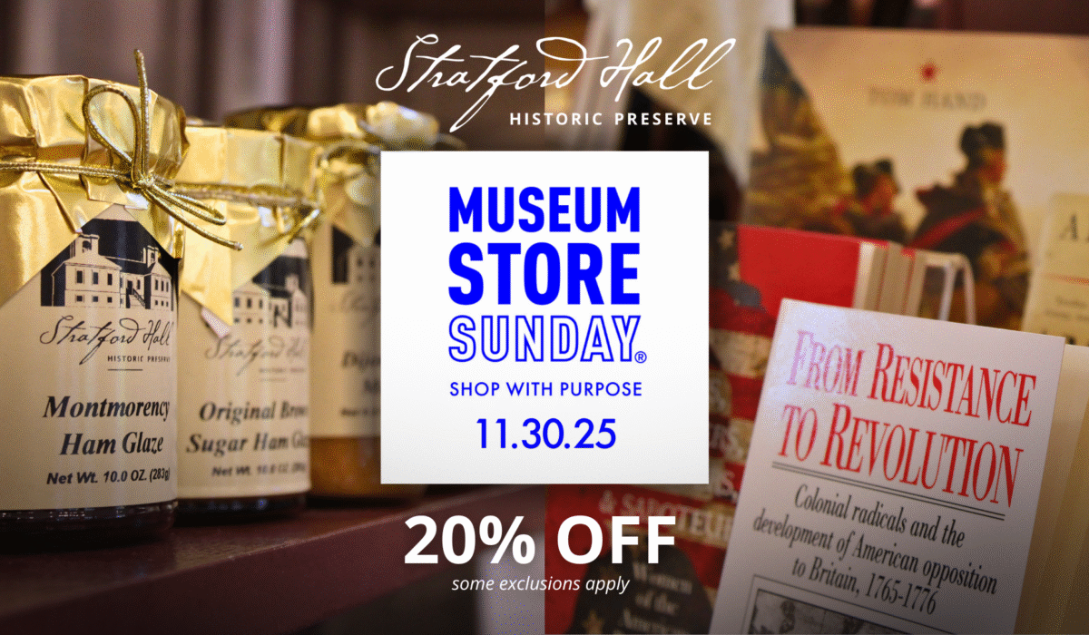 On November 30, boost your 2025 holiday shopping spree with a 20% Museum Store Sunday discount* at Stratford Hall’s charming Gift Shop! Browse Stratford merch, locally-made preserves and sauces, entertaining gifts, décor, and of course, our collection of books sure to complement the shelves of the history buff in your life. *Some exclusions apply.